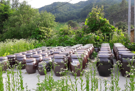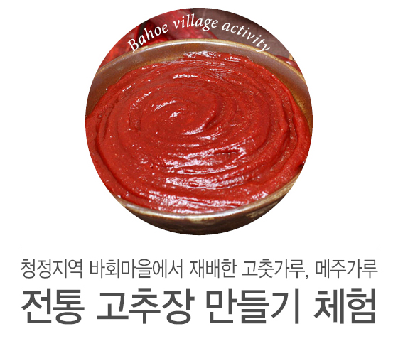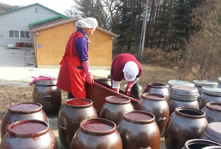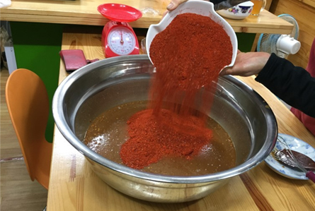 마을에서 직접 농사지은 고춧가루를 이용하여 고추장을 만든 후 용기에 담아 개별포장하여 가져갑니다.