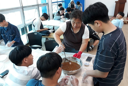 옛 선조들이 만들었던 방식으로 전통 고추장을 만들어 보는 체험으로 메주가루, 엿질금, 찹쌀가루 등을 고아서 부재료를 준비합니다.